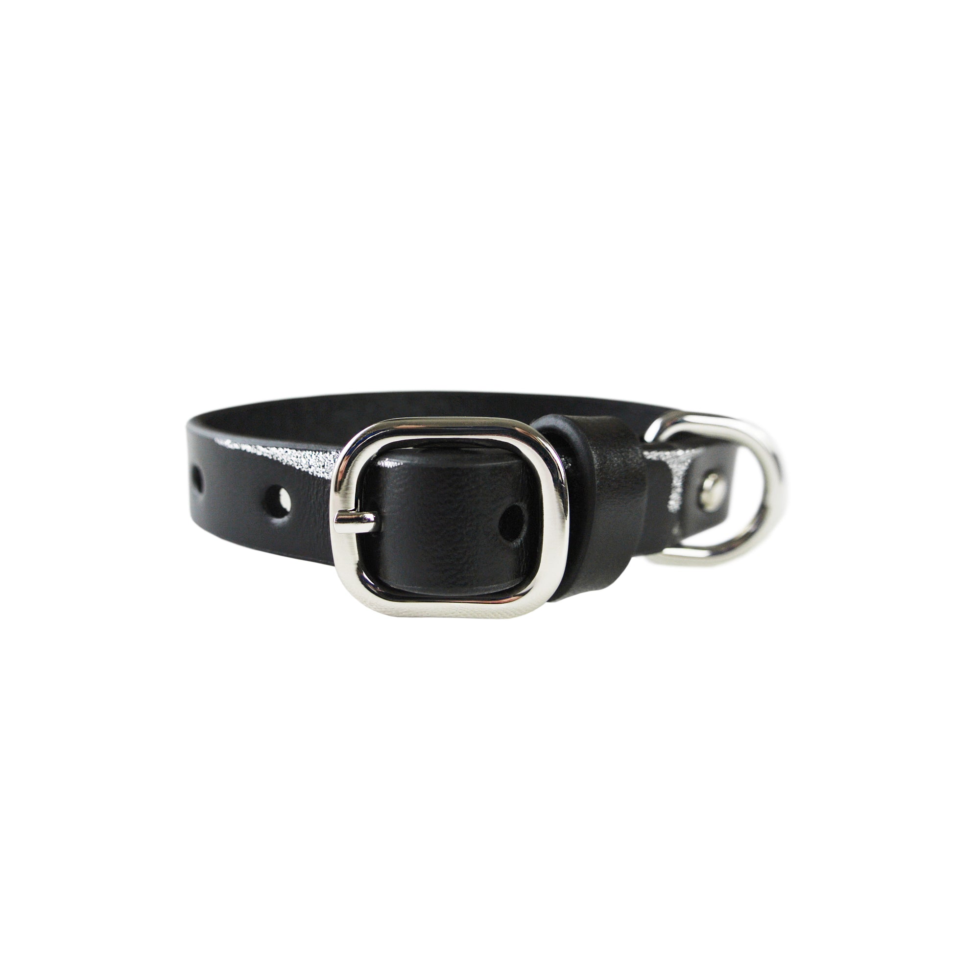 The black, Leather collar has a light feel and has been hand painted, with silver glitter.