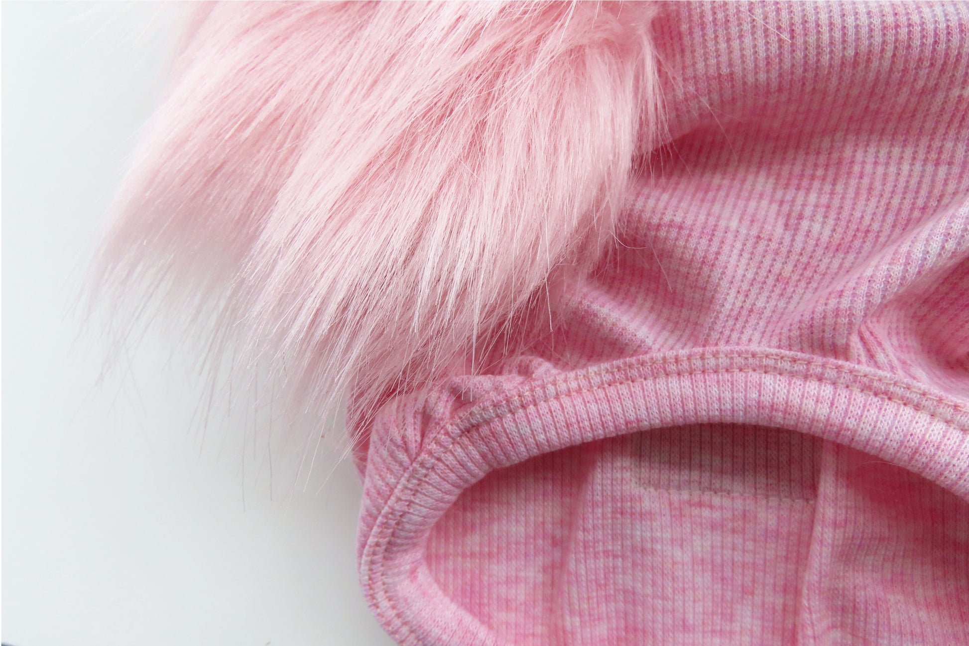 A Faux fur Dog top that is a light baby pink colour. This fun design helps you celebrate the special moments. A perfect outfit for a birthday party or special occasion. A very stretchy fit and comes in a wide range of sizing, XXXXS-LRG.