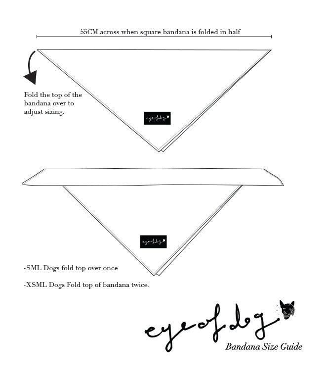 -How to wear Eye of Dog Bandanas, fold the square in half to make a triangle and fold over the top to adjust sizing and style.